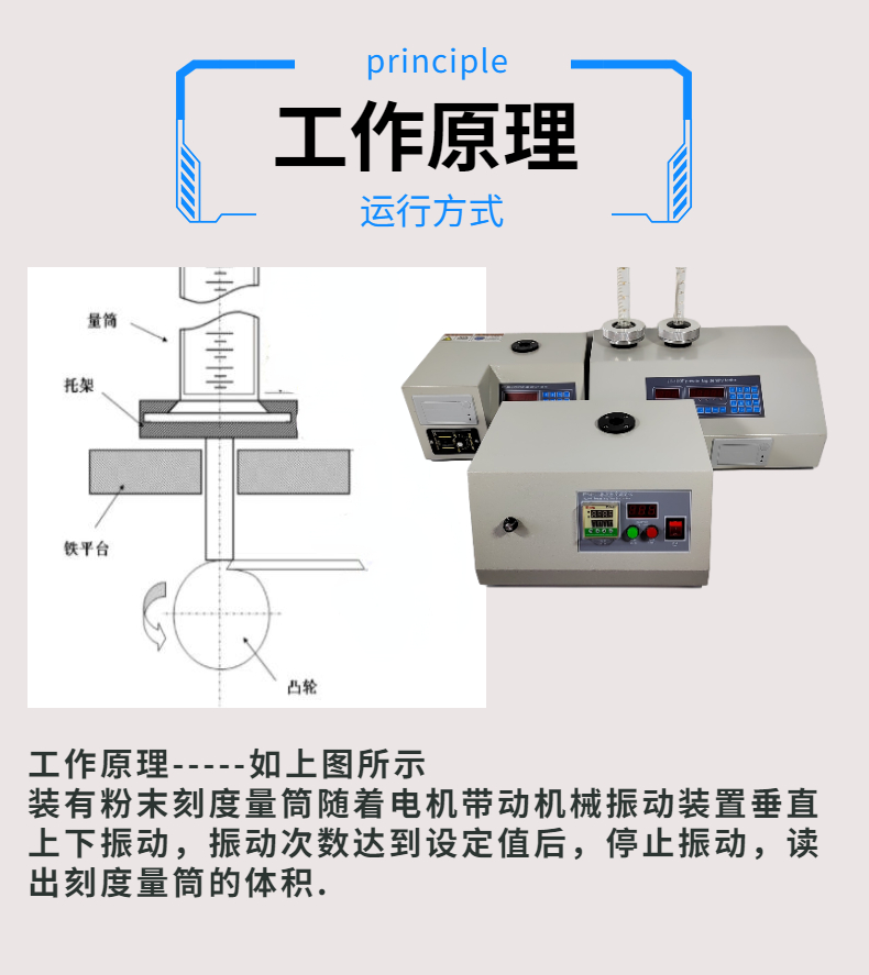 將烘干處理后的樣粉裝入樣品筒,在天平稱上稱重,將粉重及筒容積輸入電腦專業軟件,求出松裝密度數據。再將該粉筒放入儀器內。粉筒自動上下運動,使顆粒之間的間隙減小,每個顆粒趨向穩定的狀態。通過多次的振實后,樣品筒中的粉筒高度(粉筒體積)不再變化。測量粉筒中的粉體高度,然后用粉體的重量除以體積就得到振實密度。