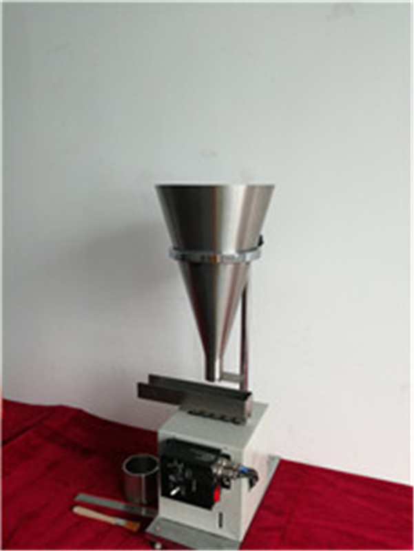 工作原理:將待測(cè)的微粉裝入漏斗,微粉在自身的堆積作用下處于堆積狀態(tài)。當(dāng)電磁振蕩器啟動(dòng)后,微粉在電磁振動(dòng)的作用下,途徑流入測(cè)量桶中,將落入到測(cè)量筒中的微粉刮平,在天平上稱(chēng)取刮平后測(cè)量筒中的微粉質(zhì)量,再除以測(cè)量筒的容積,就可以測(cè)出待測(cè)微粉的堆積密度